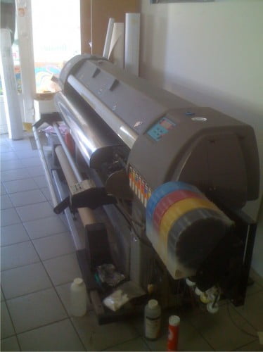mutoh spitfire 65 ecosolvent, latima maxima de printare 1600mm, stare buna->foarte buna, sistem de alimentare continuu, sistem de valve dumpers generatie noua, 4 capete (80-90% stare functionare) + 1 cap de rezerva (60-70% stare functionare), sistem de feed + takeup + ONYX RIP CENTER cu PREFLIGHT. Se vinde cu aproape 1 litru de vopsea CMYK + 1 litru solvent, cartele cu chip pentru aproximativ 4L din fiecare culoare, aparat pentru capsat bannere, si cateva consumabile (furtune, capsuri, serveteze + bureti + pompite pentru cleaning – ajung cam pentru 6-8luni de maintenance, cutit special pentru taierea materialului odata printat, etc)